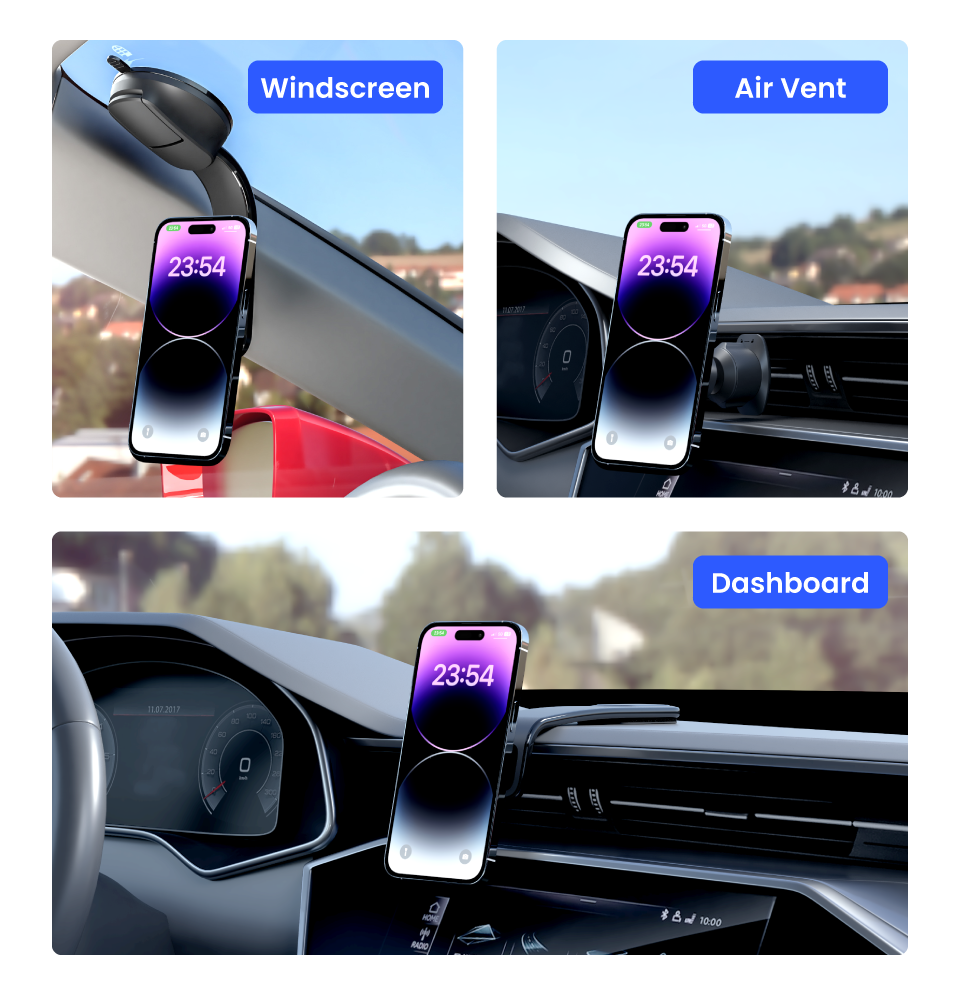 Whether you prefer the air vent, dashboard, or windscreen, our magnetic car holder adapts seamlessly to your choice.